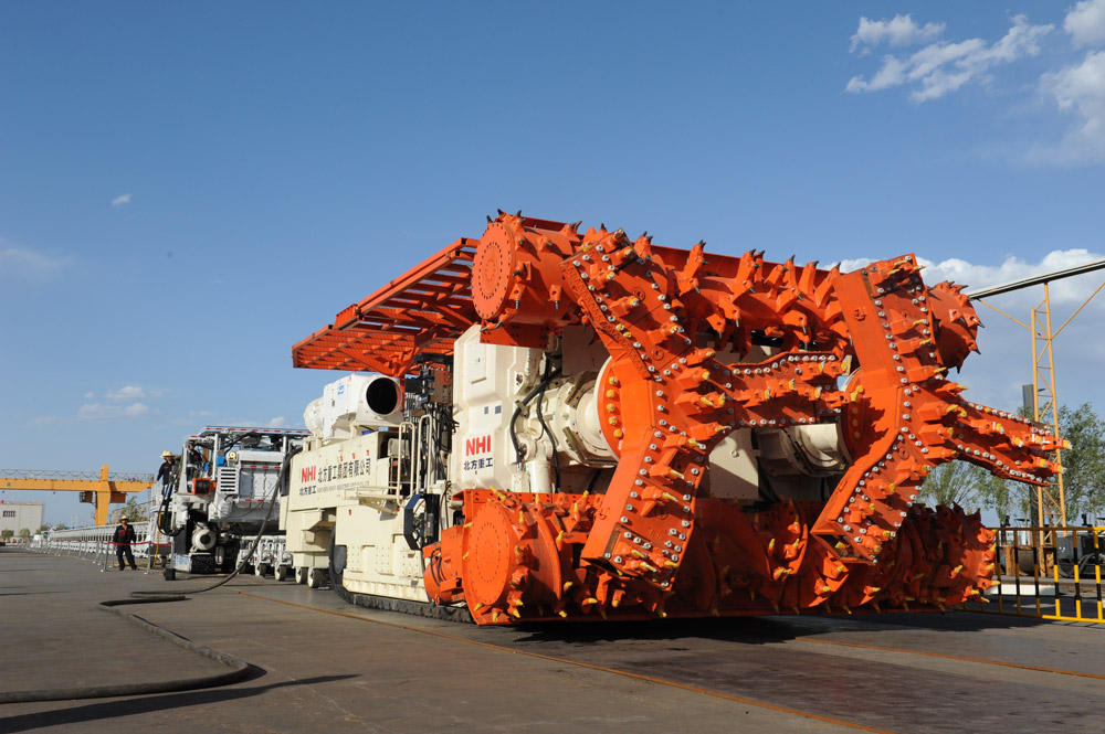 NHI successfully developed the world’s first full-section coal road high efficiency boring machine_QMJ4260.The machine has multifunction of full-section, continuous cutting technology,  automatic positioning, wireless remote control technology, fast loading and shipping, dust removing, airborne Roofbolter and shunting . It achieves coal road fast driving, long-distance remote control operation and significantly improves driving efficiency. With over 3000m footage per month, QMJ4260 boring machine achieves another technological leapfrogging in the field of coal driving.